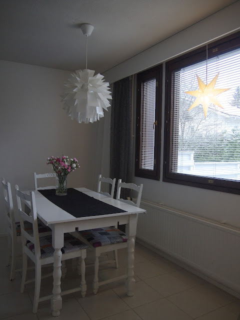 Makuuhuoneen ikkunassa ollut joulutähti sai pikasiirron keittiön ikkunaan, kun tajusin, ettei sitä tule makuuhuoneessa katseltua. Käymme yläkerrassa lähinnä nukkumassa eikä valo näy sieltä alakertaan.